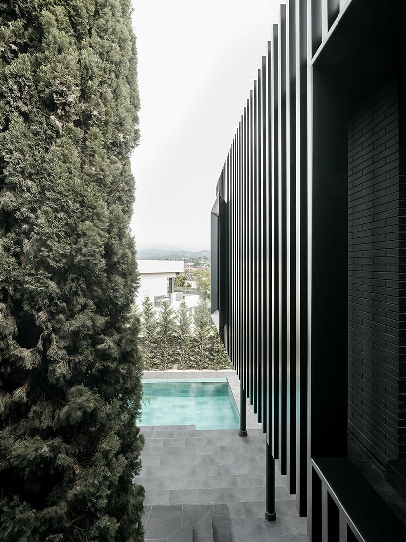 Beginning the project, the team at MDAMMM decided to preserve as much of The Black House’s original qualities as possible, by adapting and modernizing only its original color and material palettes which were deemed outdated. All elements of the facade were initially colored in a bold stroke of black to enhance the volume’s relationship with its surrounding vegetation in stark contrast. The openings were then accented with large protruding sheet metal angular frames, which project over vertical lathing with hollow sections as a double skin on the building. ‘The project seems nearly reduced to a graphic sign, monochrome and essential,’ notes project photographer, Filippo Poli.