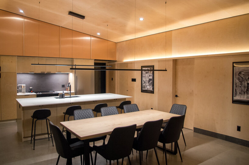 The structure’s shape recalls the traditional québecoise roof with curved ends. The chalet arranges three bedrooms and two bathrooms in the intimate zone opting to maximize the living area. The main living area walls are clad in stain-resistant Russian plywood, which adds a natural warmth to the space. On the north end of the living space, the fireplace and TV cabinet are conceptually designed together with the base made from poured concrete shaping a firewood storage area. The fireplace is clad in powder-coated steel, which wraps underneath the wall cabinet hiding the television unit. Its rounded corner allows for a fluid sense of space moving into the master bedroom.