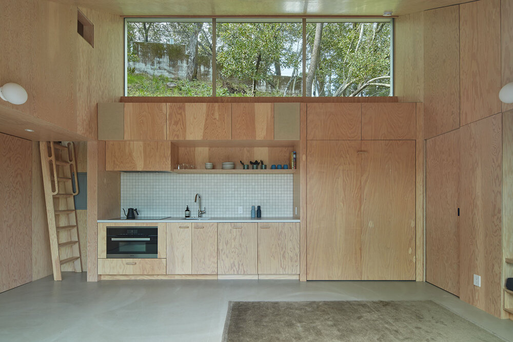 Designing for the utmost effective spatial layout, Mork-Ulnes deploys a 38 square-meter, flexible programming. ‘We had to strive to make every square meter count and program almost every surface with some sort of function,’ explains the architect. This gives the project an unsual twist, as the team needs to program all surfaces without taking attention away from standard architectural concerns like space and light. Mork-Ulnes describes this approach as a ‘Swiss-army knife functionality’. A rolling kitchen island can be moved in or outside when space or utility is needed, and a murphy bed hides in the wall during the day and folds down at night for sleeping. The loft space, with a window out towards the trees as well as down to the living space, is accessed by a ladder that tucks in to the wall. The bathroom is split into two smaller rooms – a toilet/sink and a forest-green tiled shower room with a glass door out to the tree covered hillside.