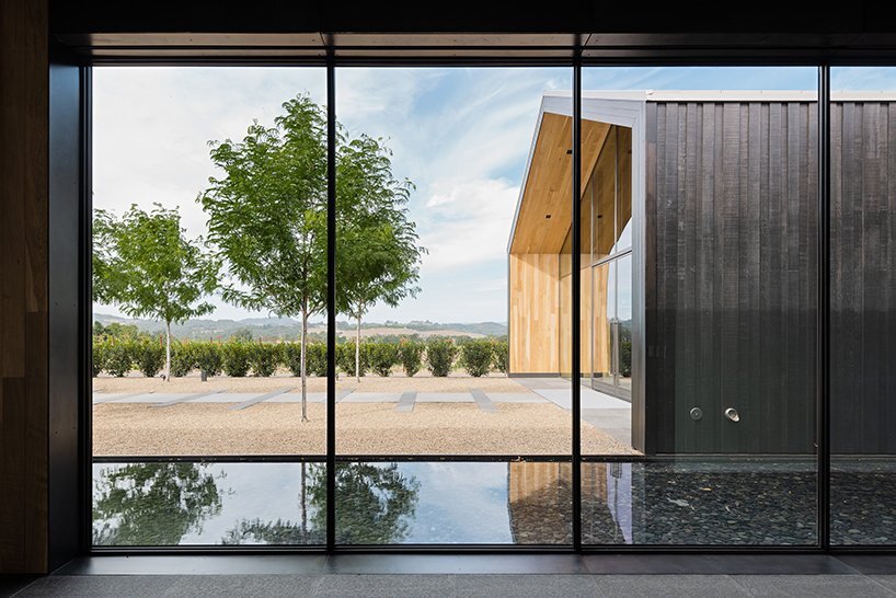 the tasting room at night with reflection in the surrounding water feature