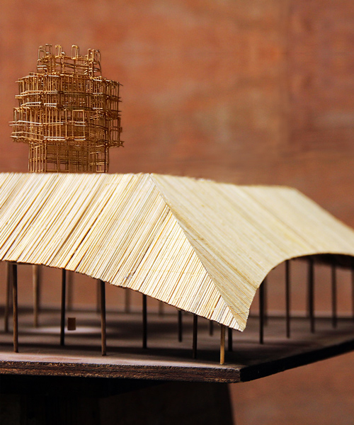 bijoy jain’s design for the MPavilion was released by the naomi milgrom foundation, a not-for-profit organization that initiates and supports public design and architecture projects. the bamboo structure will be 12 meters in height, with a earthen roof intended to represent the australian landscape. similar to a ‘tazia’ used in indian ceremonies, the pavilion is topped with a complex tower made in bharuch by a family that specializes in the ancient craft. ‘the idea is not to guide observers, but to allow discoveries through visual layers of thinking, making and seeing,’ explains jain.