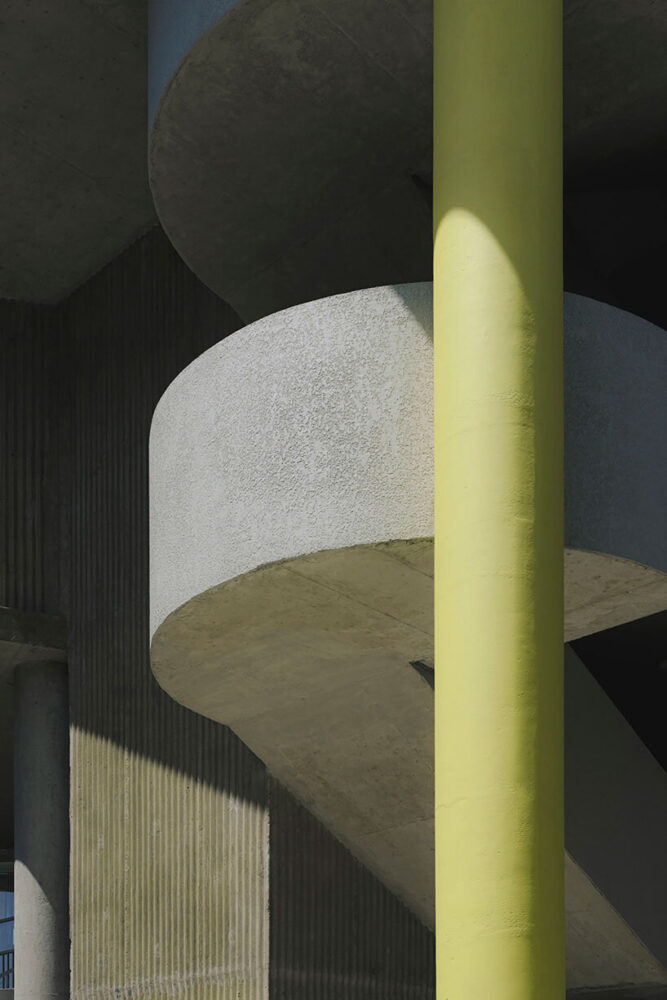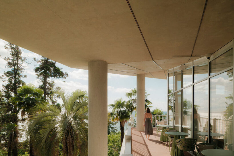 the project sits like a ring placed over the terrain, with its funnel-like roof forming a shaded perimeter walkway and an introverted core.