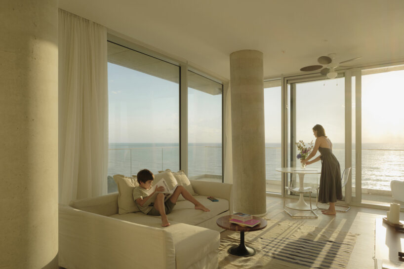 the apartment buildings feature floor-to-ceiling glass facades, offering panoramic views of the surroundings