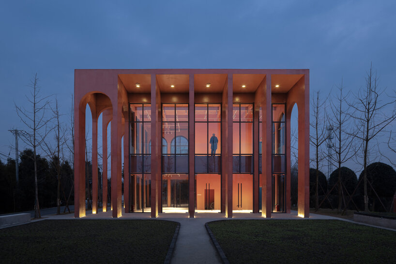 the project sits like a ring placed over the terrain, with its funnel-like roof forming a shaded perimeter walkway and an introverted core.