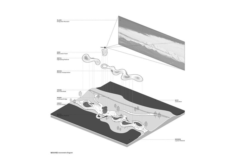 Planning its Lujiatan Wetland Park, MUDA-Architects looks to the Jinma River, a tributary of the Minjiang River, which plays a vital role in the region’s ecology and heritage. Inspired by the rhythmic flow of the rivers, the design team incorporated fluid, flowing forms into the project’s design. Thus, the architecture respects the site’s ecological and cultural significance while embracing a modern aesthetic that reflects the landscape of Wenjiang. The design avoids direct symbolism or replication of traditional forms, instead abstracting natural motifs to create a contemporary architectural expression. This balance of lightness and ecological sensitivity ensures the structure integrates fluidly with the wetland environment, establishing a new landmark for Chengdu.