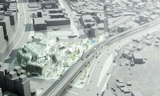 a continuation of the existing rock formations, the hotel is articulated as a series of stepped horizontal planes, courtyards, and gardens.