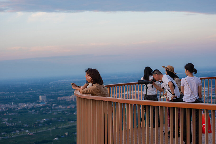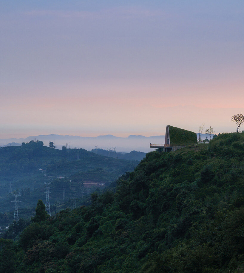 framing panoramic views toward the growing town below and the Qionglai Mountains beyond