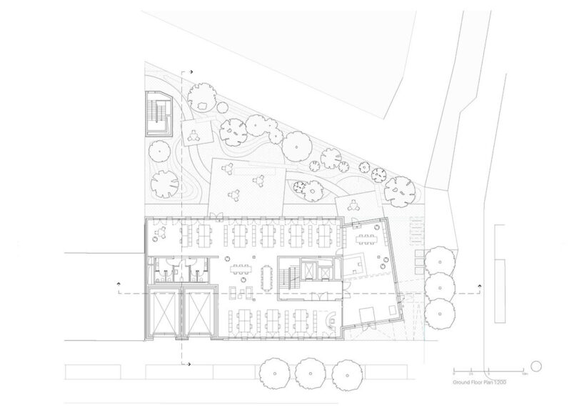 The architects at MVRDV split Munich’s MONACO into two distinct sections that symbolize the balance between work and play. The ‘work’ portion is represented by a six-story cubic block clad in reclaimed brick, while the ‘play’ section is a more dynamic structure clad in colorful shingles. This playful portion extends upward and over the main block, creating outdoor terraces covered with greenery to be curated by landscape studio Landschaftsarchitektur Huber. These terraces serve as social spaces, complementing the more formal office areas. The building’s angled walls and large windows offer panoramic views of the district and create a welcoming environment, leading into a triangular pocket park that will be developed behind the structure.