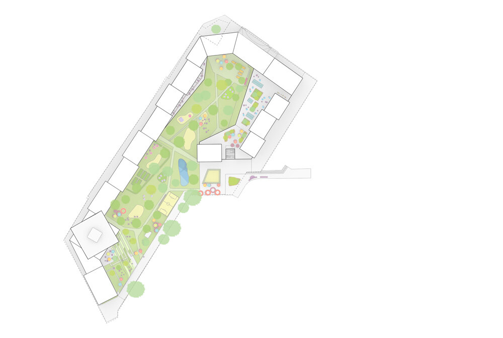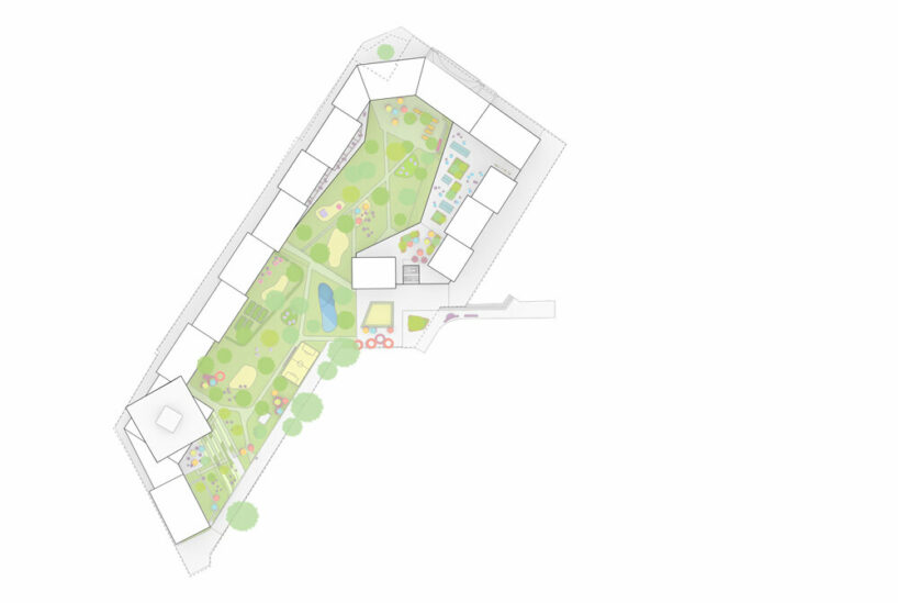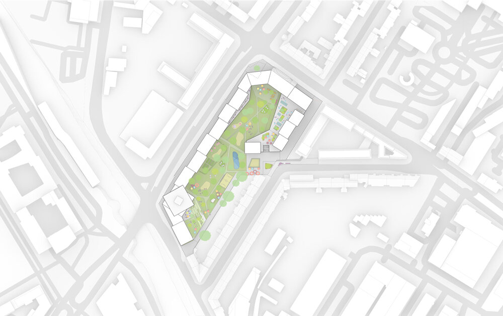 MVRDV (see more here) and LOLA (see more here) conducted a series of workshops to involve residents in the development process. Interviews were held, and brainstorming sessions took place to gather ideas. Through this collaborative process, key requirements emerged, including the importance of retaining the supermarket as a social meeting spot, improving connectivity to neighboring city districts, and incorporating public spaces for an inclusive social environment. Designers presented three outline proposals for residents to discuss, with the Grüne Mitte design, featuring blocks around a central green space, being the most popular choice. The central park-like space within the block reduces paved or built surfaces from 98 percent to 62 percent, serving as a community hub accessible through various passages. This green area features amenities like kiosks, sports facilities, and playgrounds, contributing to increased biodiversity and a pleasant microclimate.