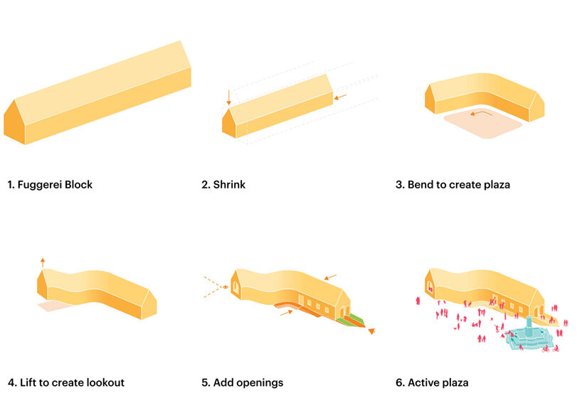 To test these principles, MVRDV also developed three proposals for Fuggerei both inside and outside Europe. The first is proposed for the original hometown of Augsburg, Germany, and is distinguished from the original Fuggerei by its educational focus, aiming to provide self-determination and to reduce the city’s wealth gap through education.