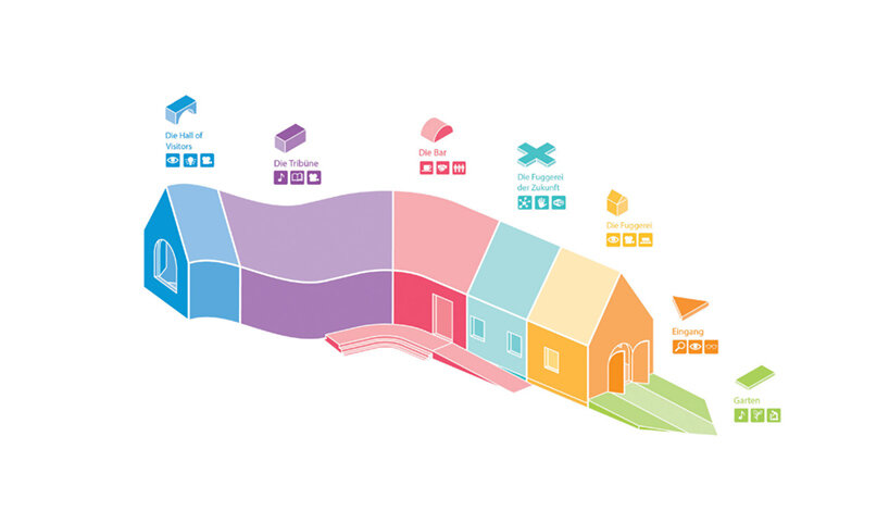 For the exhibition, MVRDV and the Fugger Foundation studied the existing complex in Augsburg and, in line with the Fuggerei’s newly written ‘Fuggerei Code,’ distilled the complex’s formula for successful social housing. The result is eight simple ‘building blocks’ that provide the basis for a system for new Fuggerei that can be adapted to differing contexts worldwide. These building blocks are also referenced in the pavilion’s internal layout, with eight different spaces for the exhibition and events inspired by the eight building blocks.