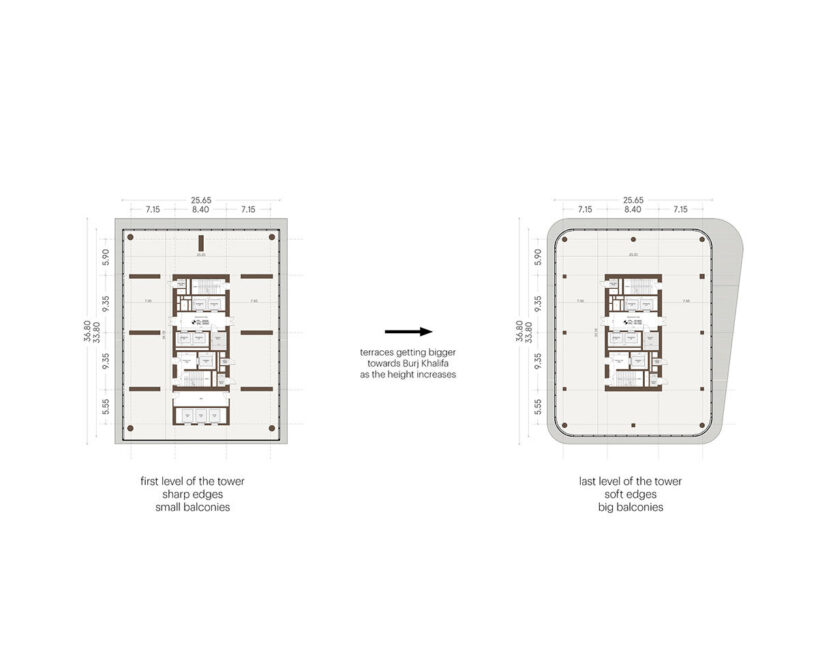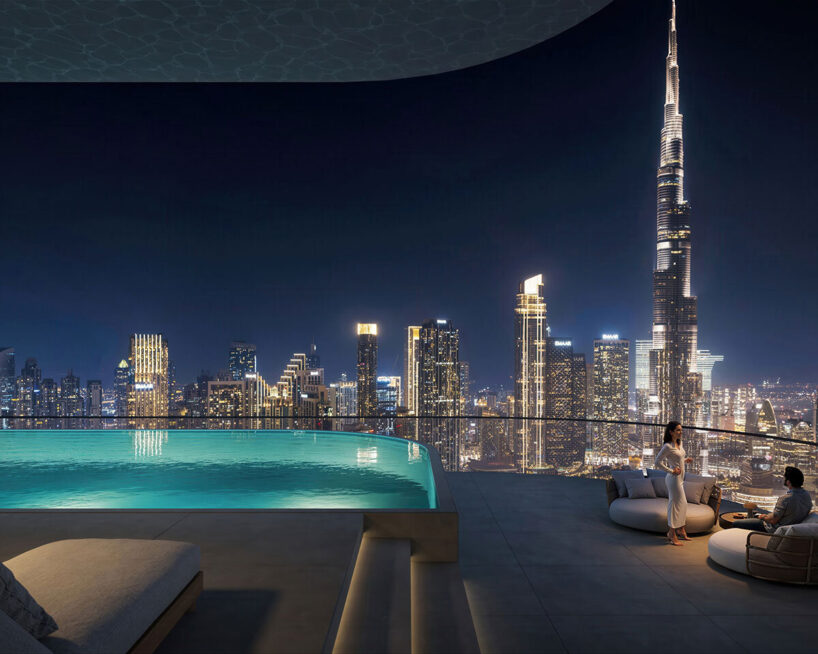 Along the northern elevation, balconies widen as they climb, extending outdoor areas for the sky villas and opening views toward the Burj Khalifa. With this calibrated variation, the team reinforces the building’s vertical progression all while maintaining a coherent design language.