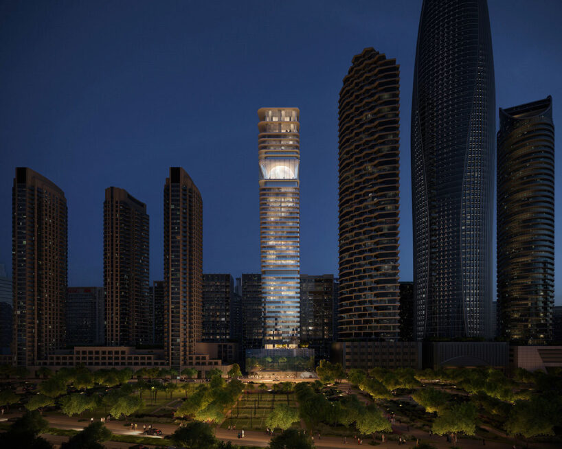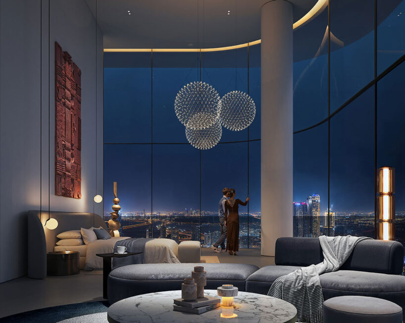 To stand apart within the crowded stretch of skyline, the stacked floorplates separate to accommodate a luminous ‘ovoid’, or egg-shaped volume nestled at roughly three quarters of the tower’s height. Suspended behind a glazed envelope, this pearl-like structure will be experienced with its own interior space rather than just as a massive artwork. From a distance, it registers as a soft orb of light, visible from multiple vantage points across the Emirati city.