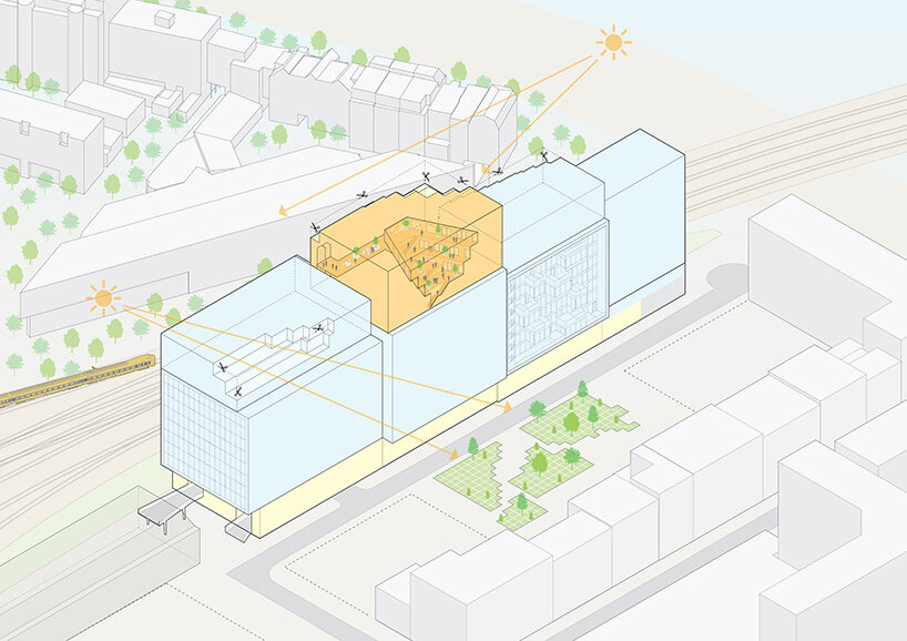 Located within the Schiekadeblok, a post-war district that evolved into a cult destination for creative businesses, bars, and clubs, the project BY MVRDV echoes the area’s protected character. The Dutch firm divides the long, narrow building into four horizontal segments, each with a distinct plinth and one or two blocks above, referencing the scale of the surrounding reconstruction-era architecture. Carved upper volumes respond to the angle of the sun, preventing shadows from falling on residential areas across the tracks, demonstrating a sensitive approach to densification.