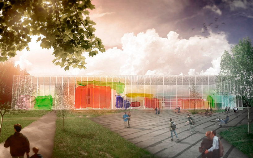 kandinsky created a formal and unique language based on music, color, and shapes while van der rohe experimented with transparency, silence, and geometric purity. on one side of the conceptual structure, gias has created a glass box, oriented to the site’s park space to invoke a sense of calm and serenity. however, the colorful palette of kandinsky comes through in full force, actively engaging with the city at large. gias’ goal was to create a unique space, easily identifiable as bauhaus, with an internal rhythm that brings history into the present