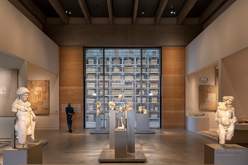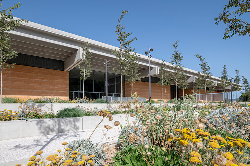 the project sits like a ring placed over the terrain, with its funnel-like roof forming a shaded perimeter walkway and an introverted core.