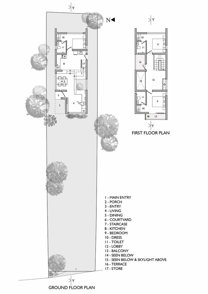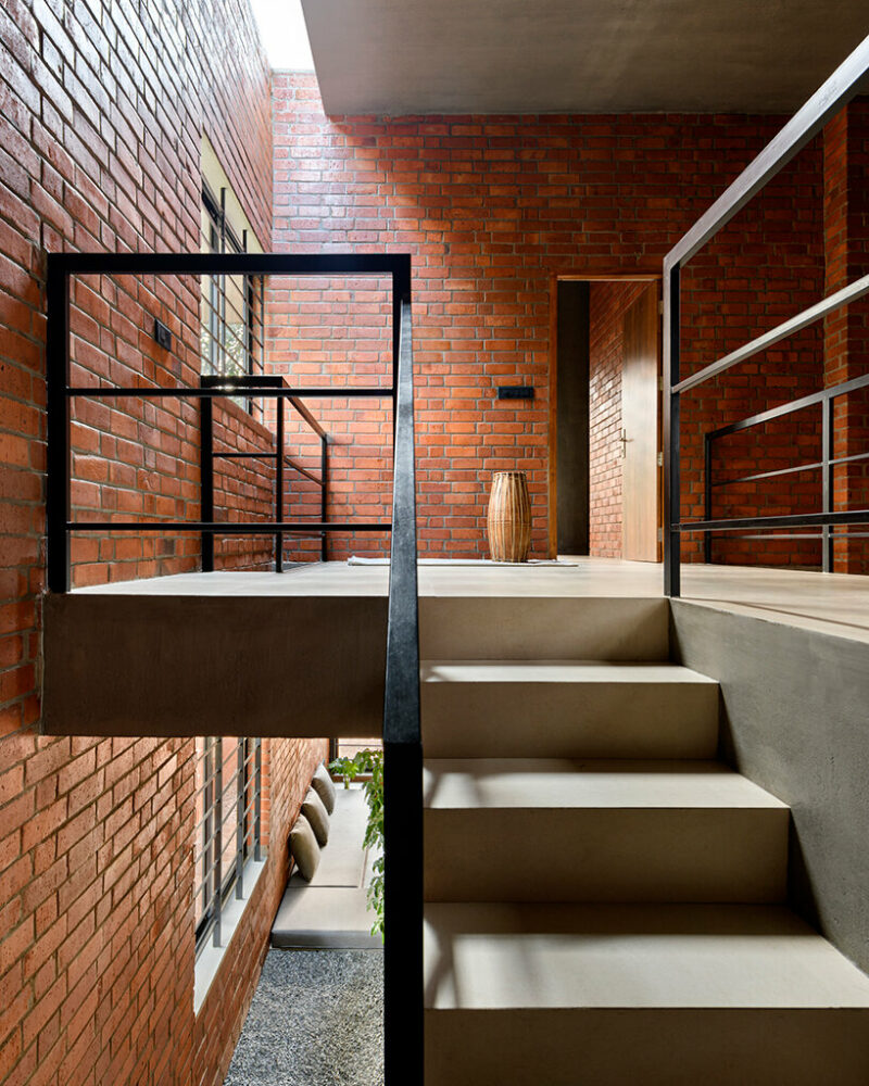 The design team with Architect Srijit Srinivas (see more here) describes the Narrow Brick House: ‘Despite the narrowness of the building envelope, the interior spaces did not compromise on the ingress and movement of light and air circulation. The design also took advantage of the longitudinal slope of the site via a stepped-down floor plate following the natural contours of the land, and in the process optimized foundation costs.