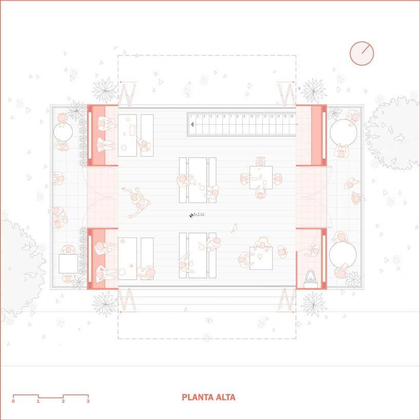 the project is delimited laterally by two brick walls; the right side contains services, such as bathrooms and a storage room, while the left side houses furniture for social gatherings. on the first floor, the kitchen and the food bar are located; built from the brick rubble of the same construction. on the second level, balconies and terraces provide a place to meet and spectate.