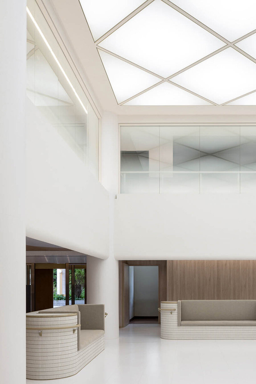 upon entering the facility, visitors are welcomed into an entrance hall featuring unglazed tiles