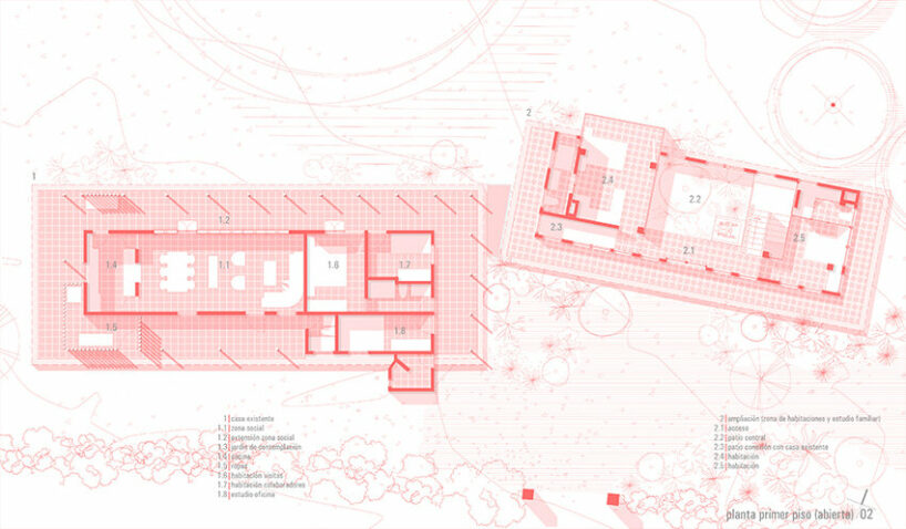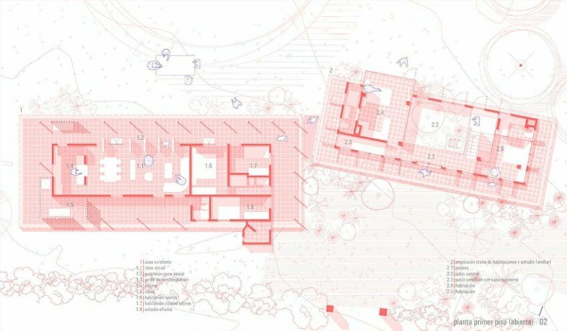 The resulting house extension, therefore, reveals a striking ‘tension’ between tradition and modernity; emerging from the center is a glazed volume delineated on three sides by clay-tiled eaves echoing the colonial archetype just a few meters away. These structures ‘approach each other, but do not touch, resulting in a small uncovered expansion that represents a transition of uses,’ notes the team.