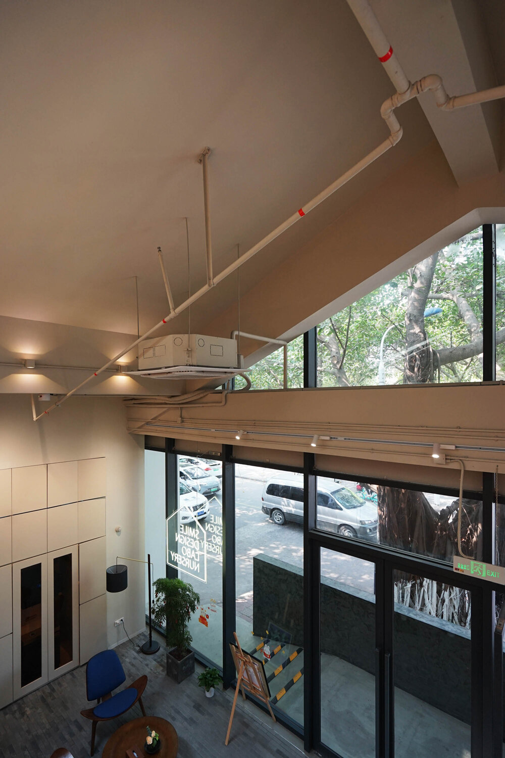 the absence of ceiling finishing materials highlights the raw simplicity of the structure