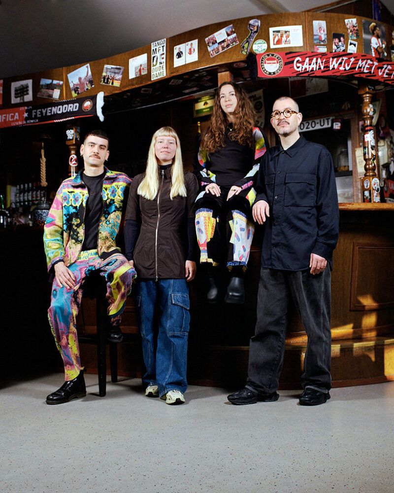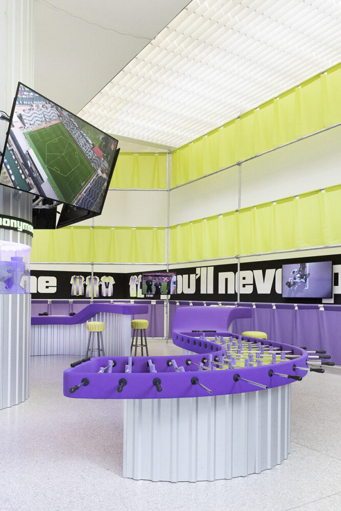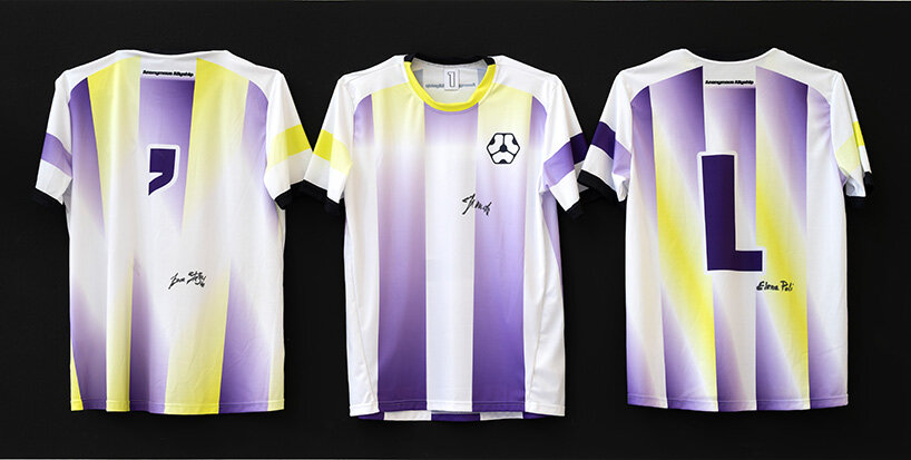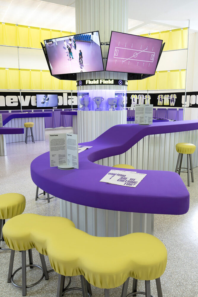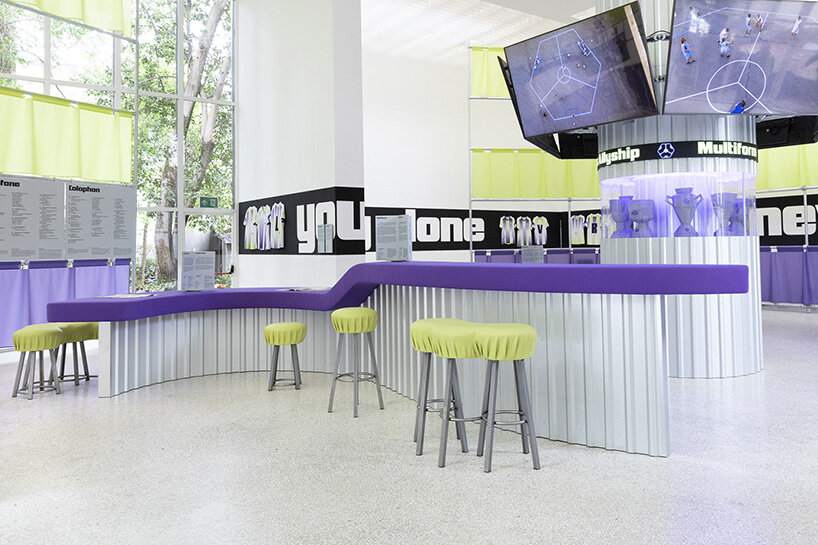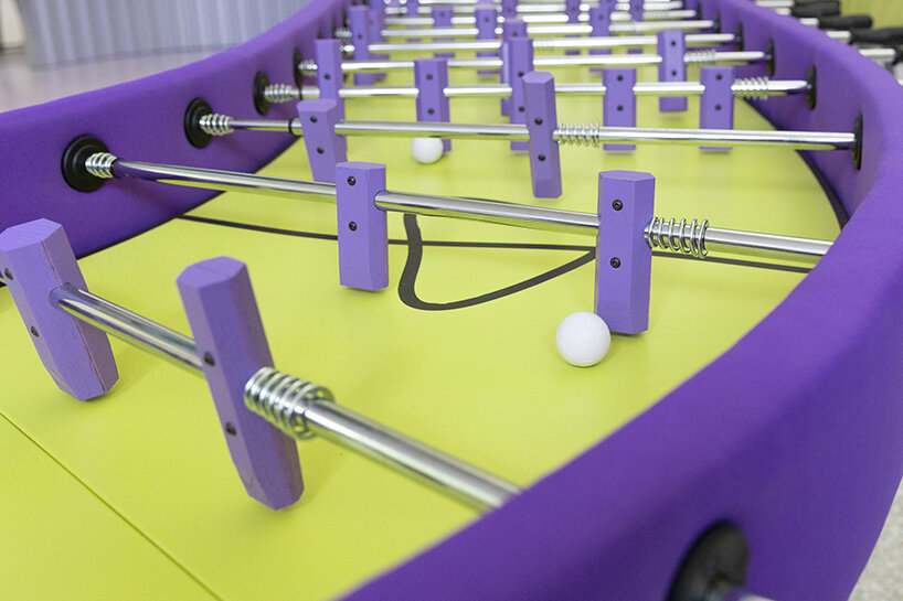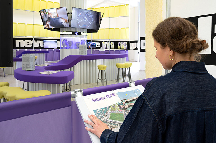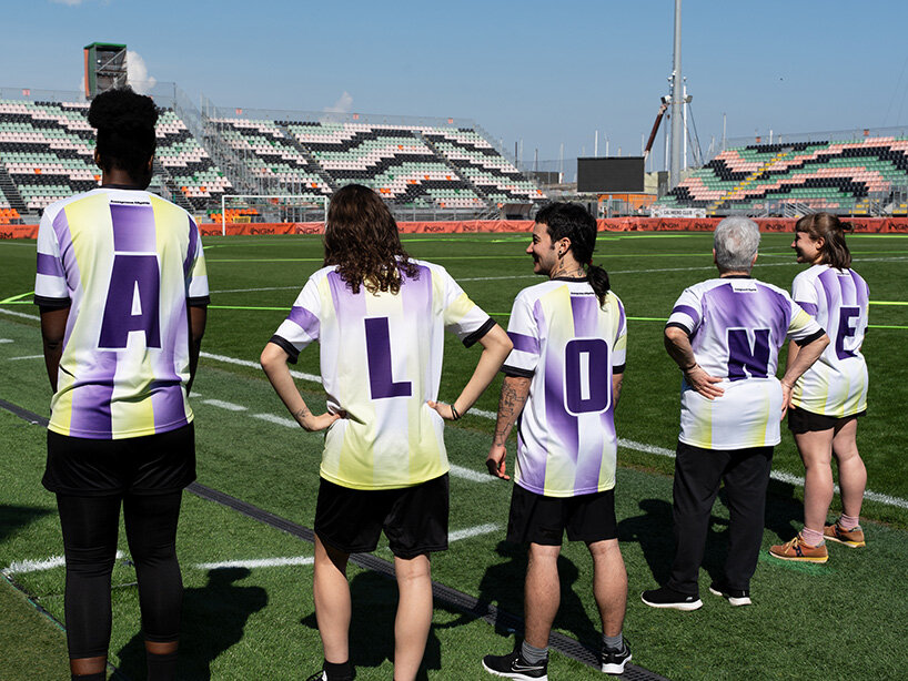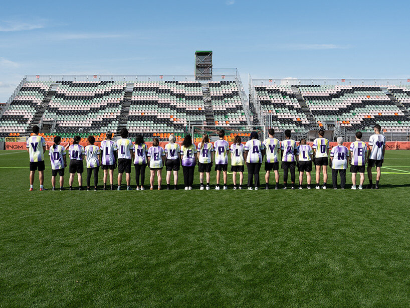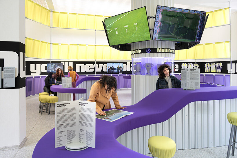 ‘Drawing on Sara Ahmed’s theory of queer phenomenology, we have intentionally queered this space – transforming it into a sports bar that serves as a model for new modes of togetherness,’ Amanda Pinatih tells designboom in an exclusive interview. ‘This is a welcoming space where fluidity and experimentation can lead to a sense of empowerment for visitors. At our sports bar, sports is a tool for bridging diverse communities.’ Players wear shifting jerseys, compete without defined teams, and interact in fields that morph in real time. The goal? Not victory—but connection. ‘By deconstructing the spaces, uniforms, and tools of sport, we can question the conservative values that these elements reproduce and challenge their role in shaping identity,’ explains Gabriel Fontana. ‘Rather than seeing design as merely functional in sports, we will explore how it can be used to radically rethink the values and norms we want to promote on and off the field.’ Amanda Pinatih and Gabriel Fontana explain their approach in depth—keep reading for the full conversation.