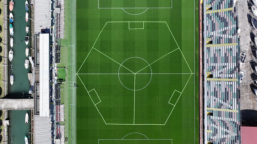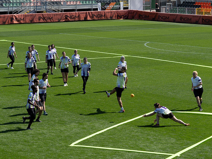Responding to the Biennale’s 2025 theme Intelligens, SIDELINED proposes that architecture isn’t just about buildings—it’s about behavior. ‘Rather than positioning queerness solely as an identity, I treat it as a method—one that challenges norms and creates space for different ways of being, relating, and cooperating,’ designer Gabriel Fontana shares with designboom. ‘These games remove fixed roles and visible groupings, disrupting the standard logics of competition and hierarchy.’ As cheers echo through this queered bar, the Netherlands Pavilion proves that even the most familiar arenas—like sport—can become experimental grounds for empathy, solidarity, and social transformation. Dive into our full interview to hear how architecture meets activism on the field.