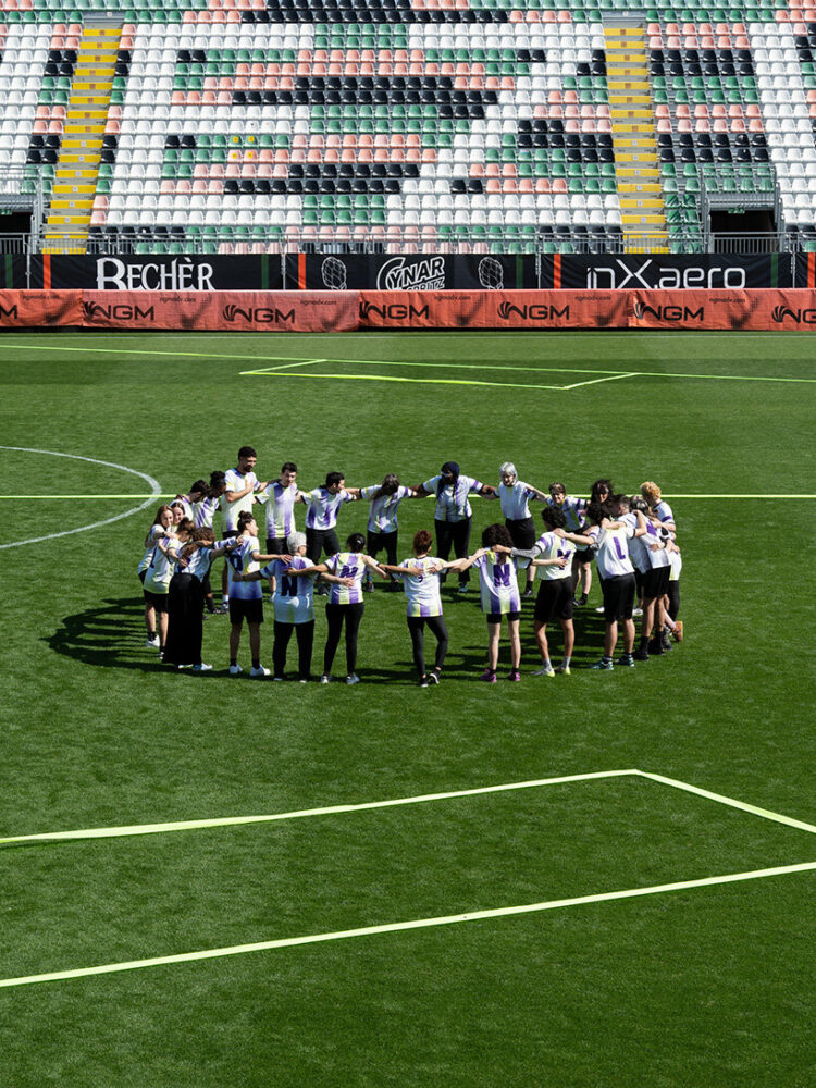 Anonymous Allyship explores how belonging influences feelings, behaviour and performance in a group. The goal is to provide a tangible experience of both inclusion and exclusion, revealing the impact of social connection or alienation on individuals and society. In Anonymous Allyship, players come from different generations and communities without traditional visual cues to distinguish their teammates. Everyone wears the same jersey, creating an outside appearance of a single, unified team. However, hidden clues discreetly given players individually create a new dynamic. The first moments of play are filled with uncertainty: To whom do I pass the ball? Who are my teammates? By noticing and remembering how others attack or defend, the players start to understand which team they belong to. From there, patterns start to form.