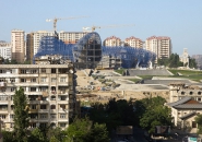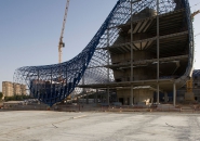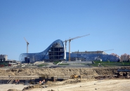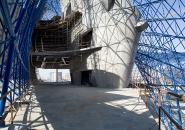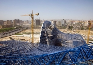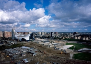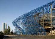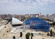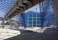 the project sits like a ring placed over the terrain, with its funnel-like roof forming a shaded perimeter walkway and an introverted core.