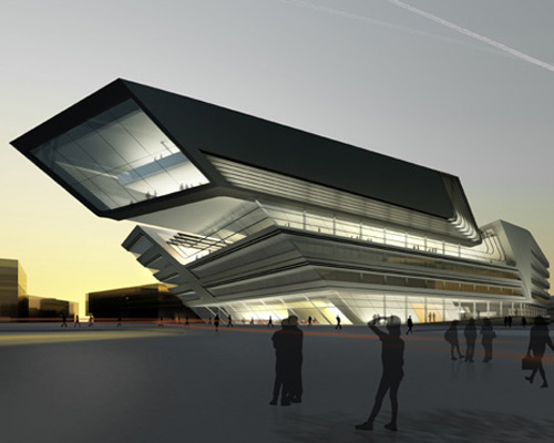the project sits like a ring placed over the terrain, with its funnel-like roof forming a shaded perimeter walkway and an introverted core.
