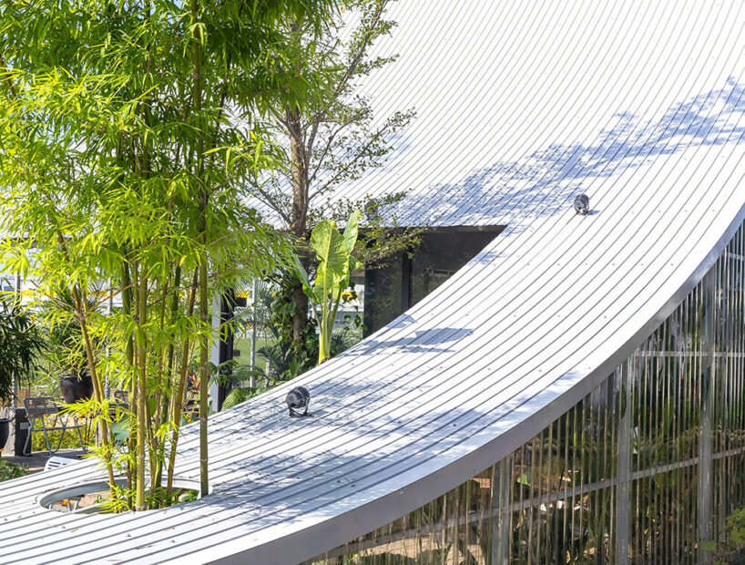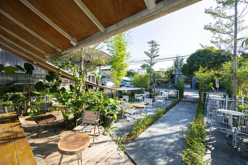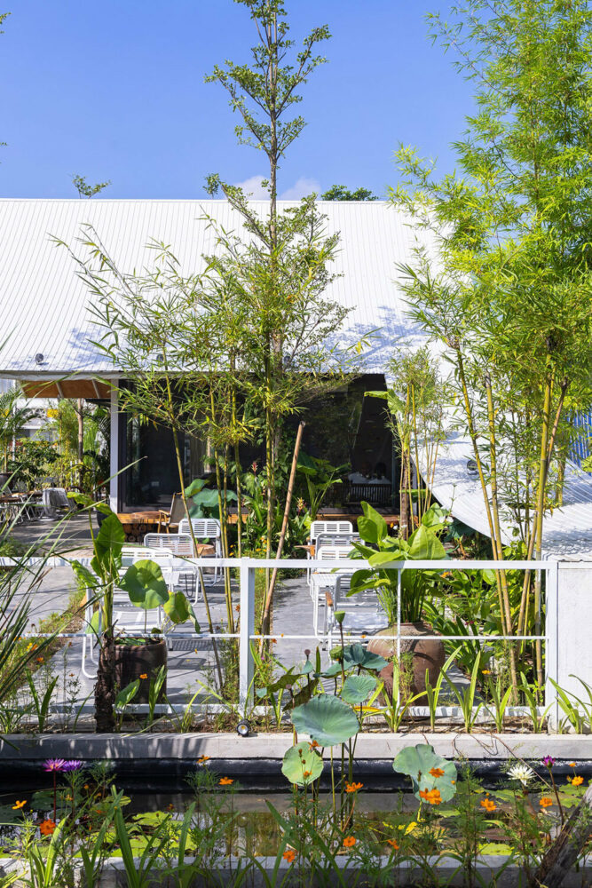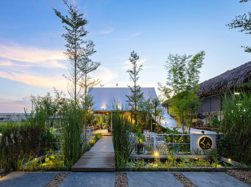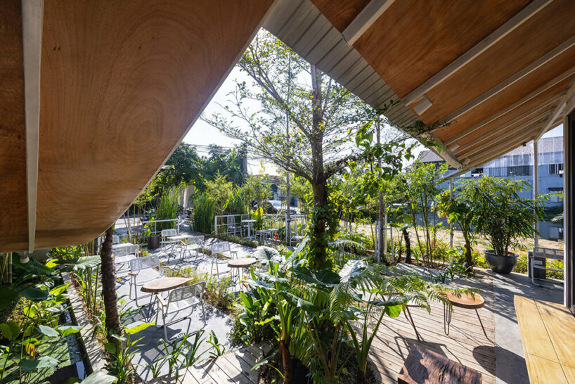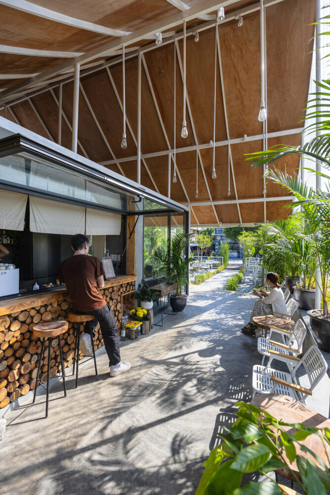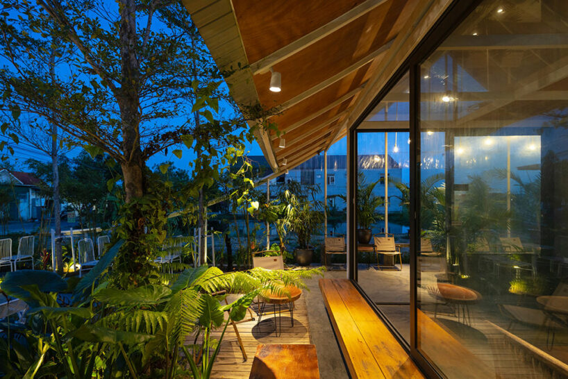 Combining all of these features, the studio’s construction approach proved to be time-efficient, with reduced labor and a high investment in a demountable structure for reuse elsewhere, if needed. The flexible outdoor space at Ká Coffee extends into two front and backyard areas, giving the feel of an outdoor picnic atmosphere. In addition to the large main roof structure, the space can also be expanded flexibly with anti-service roofing systems for flexible use. ‘The selection of plants for the shop is also considered to limit costs but enough to bring local characteristics to the shop. Like taking advantage of the plants available in the region, such as wax, elephant grass, banana, bamboo, etc. Utilizing the guidance of local workers to build a shop is also an advantage in reducing construction costs. [It] is a unique model, environmentally friendly, low price, recyclable material – typical for the next sequel models that the design team aims for,’ concludes Nguyen Khac Phuoc Architects (more here).