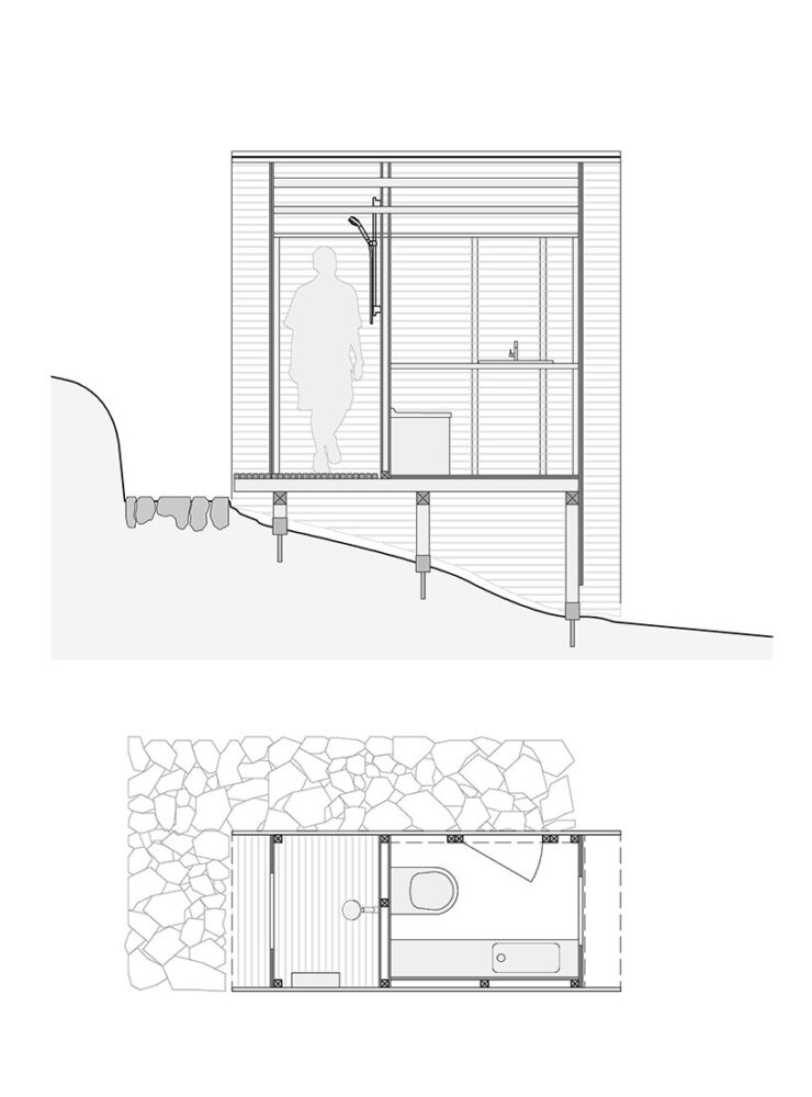 Within, a panoramic window offers expansive views of the rolling green hills, enhancing thegoodviewloo’s connection to the surroundings. Two zones divide the bathroom: one side contains the toilet with a washbasin, while the shower is located at the back. The latter is designed as an open space that cannot be seen from the street due to the natural topography.