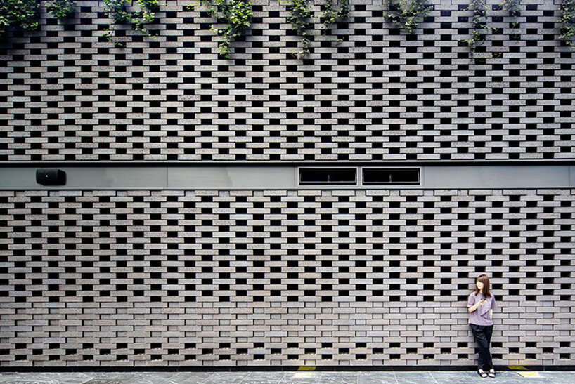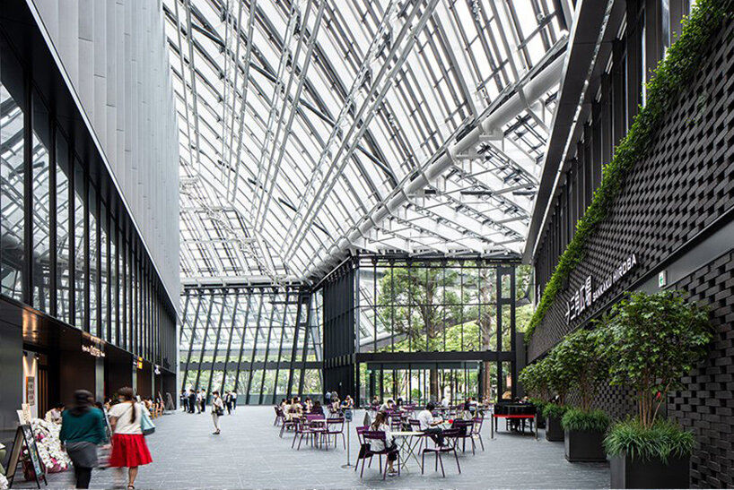 the project sits like a ring placed over the terrain, with its funnel-like roof forming a shaded perimeter walkway and an introverted core.