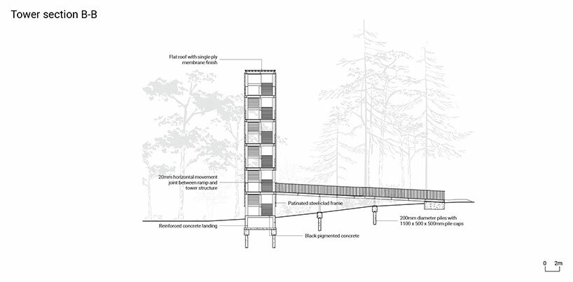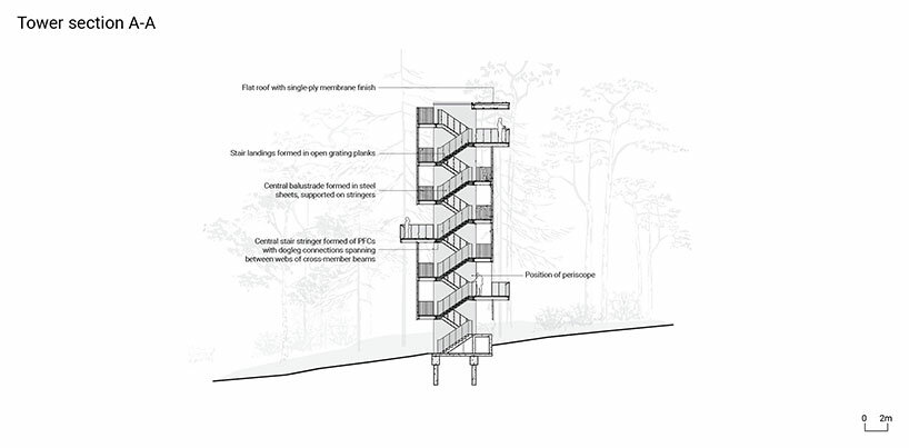 the tower visually blends into its natural surroundings with a permeable skin of charred larch, enclosing the patinated metal core and galvanized steel stair. eventually, the architecture will weather to become a silvery gray, matching the tones of the scotch pines from which it emerges.