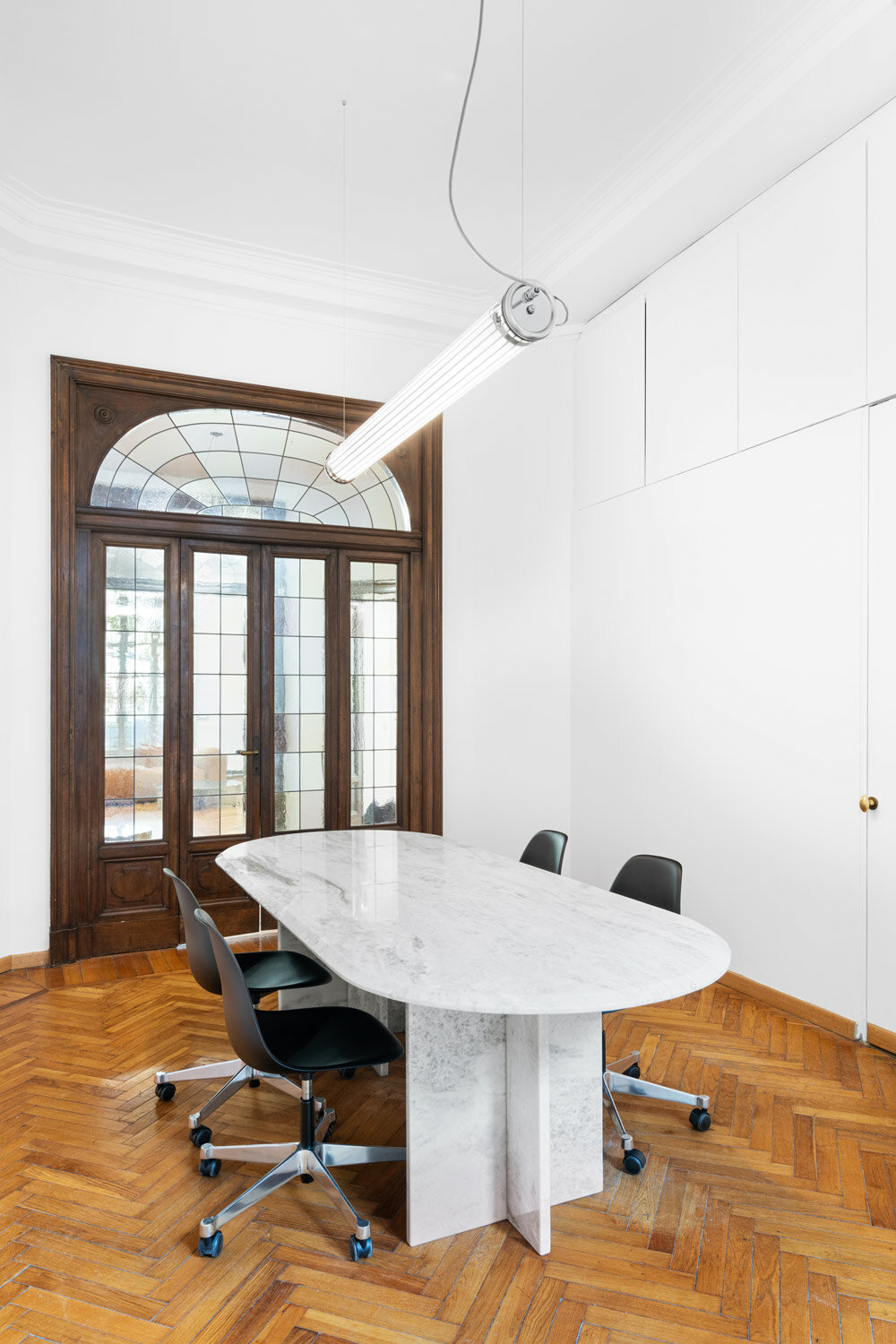 Balancing simplicity and innovation, the team adds a gentle playfulness to regular shapes, creating pieces that stand out. A semicircular configuration made of clothing racks is placed next to each other to create an intimate alcove in the center of the showroom where informal meetings can be hosted. The meeting room features a table made entirely of Azul Calcite marble with 30° beveling. Above the table, an anti-blast stainless steel lamp is suspended on steel cables, adding soft light reflections.