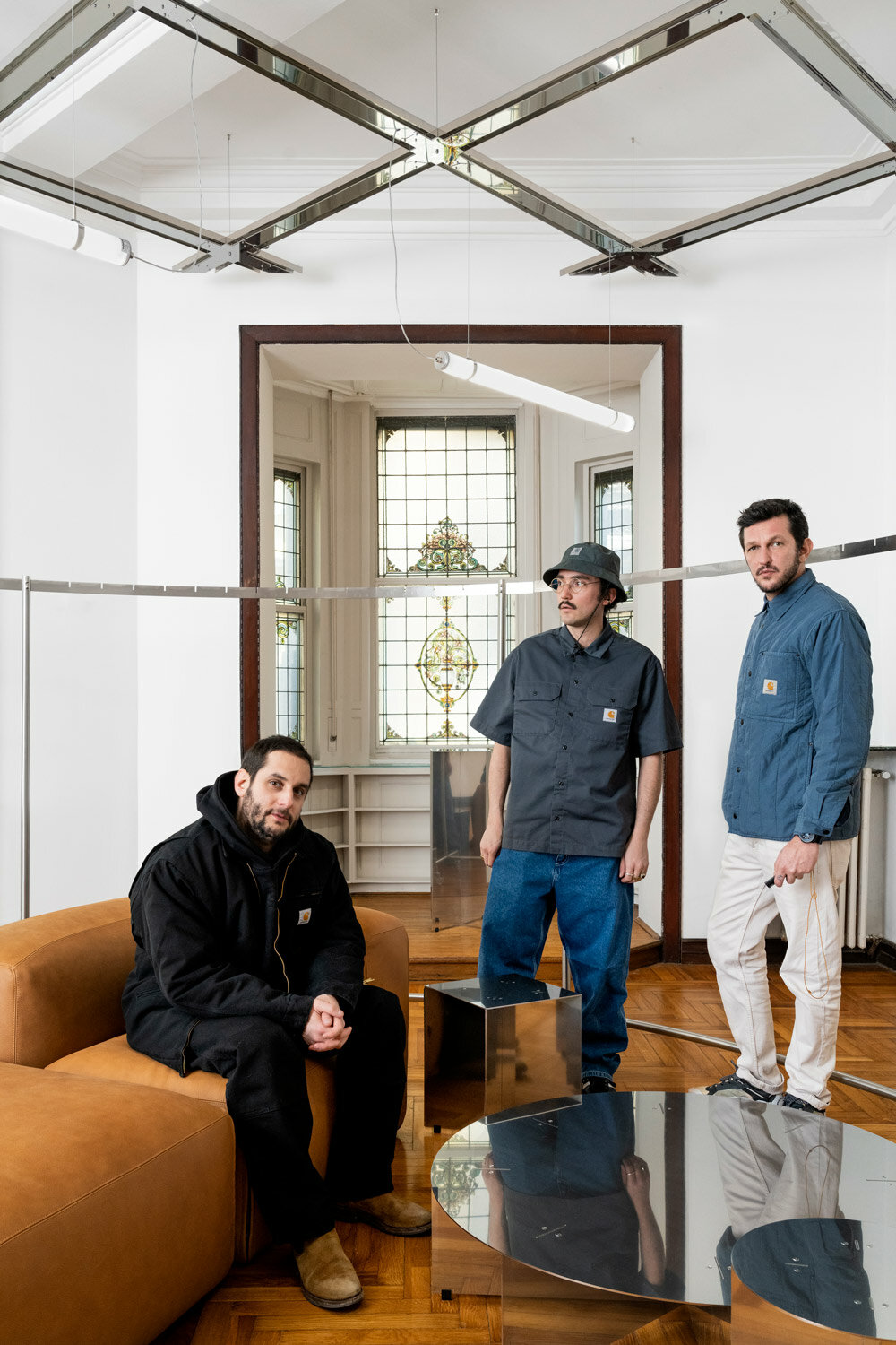stainless steel cross ceiling + custom furniture adorn reference studios' showroom in milan