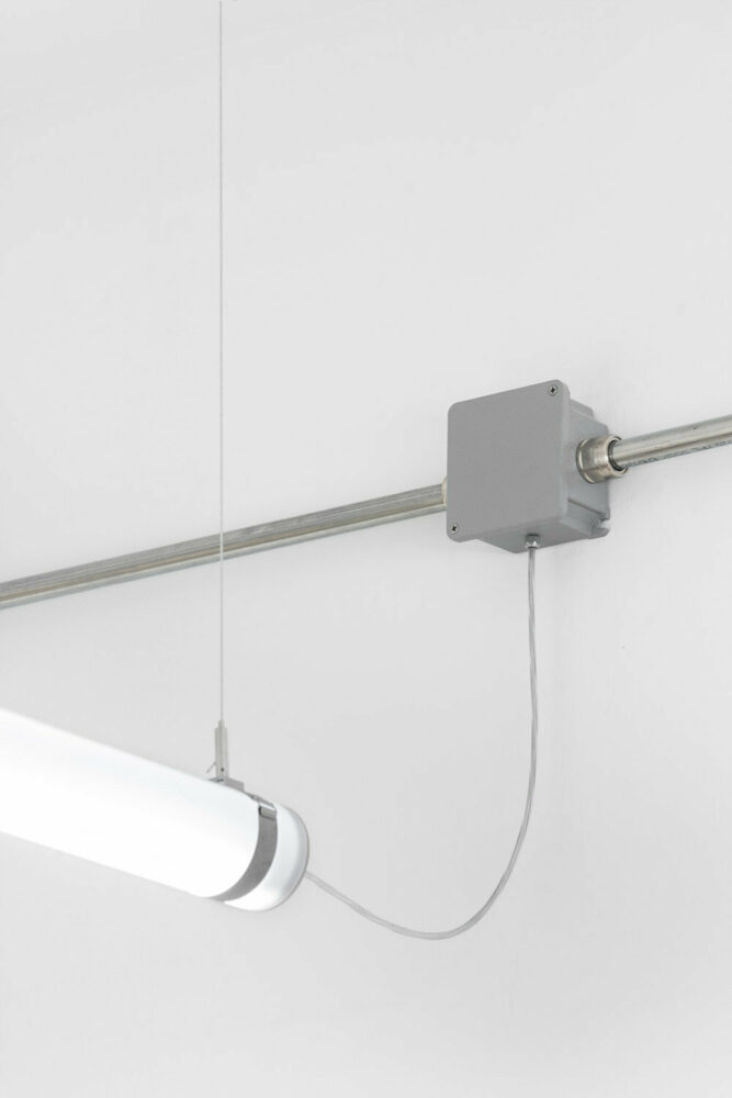 a criss cross stainless steel structure hangs from the ceiling to accommodate all the technical infrastructure