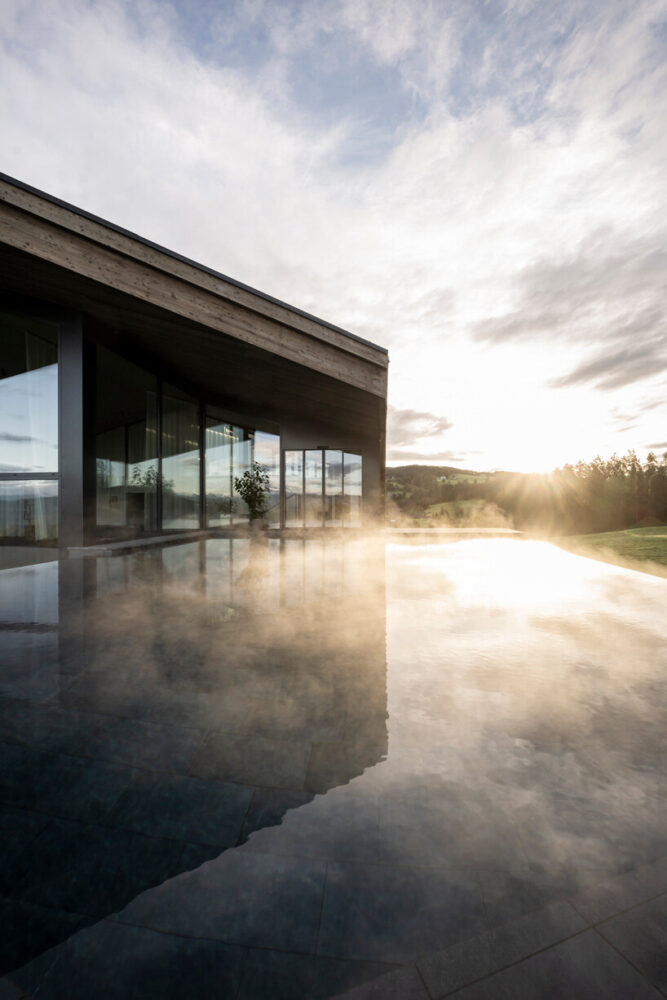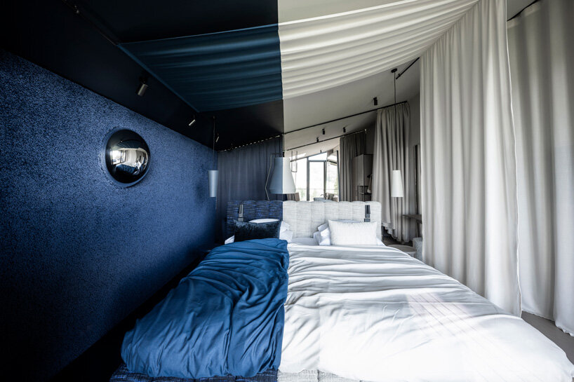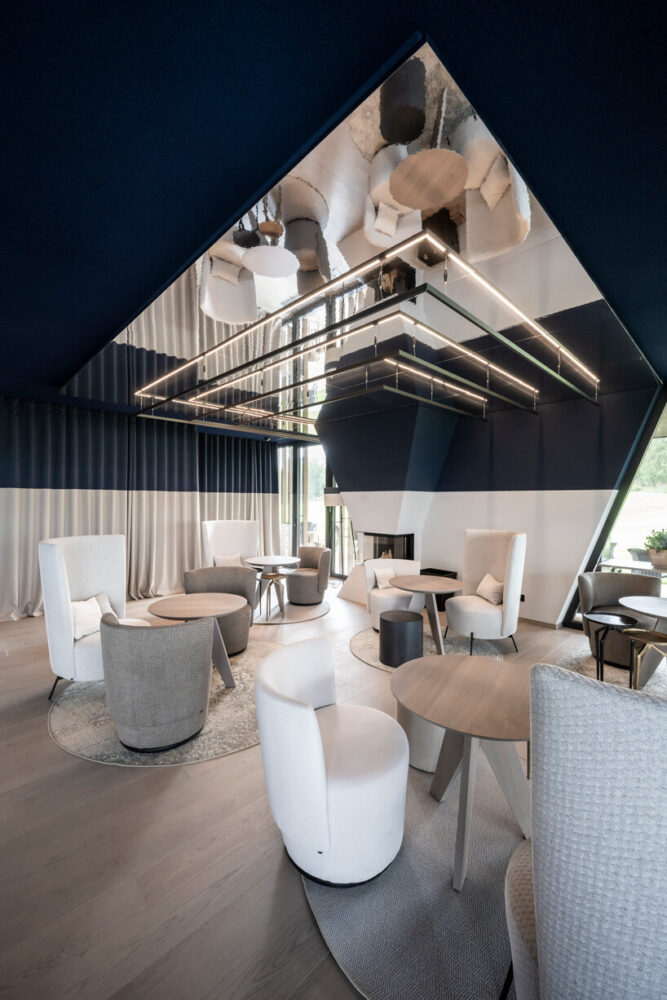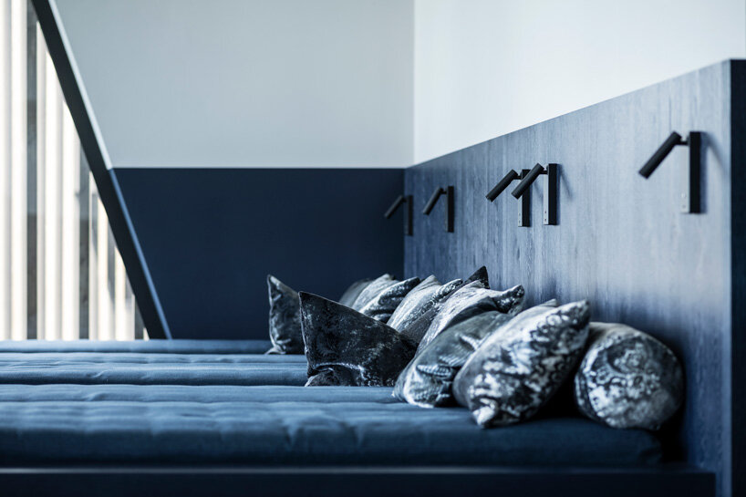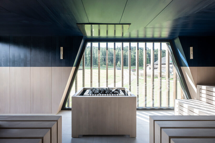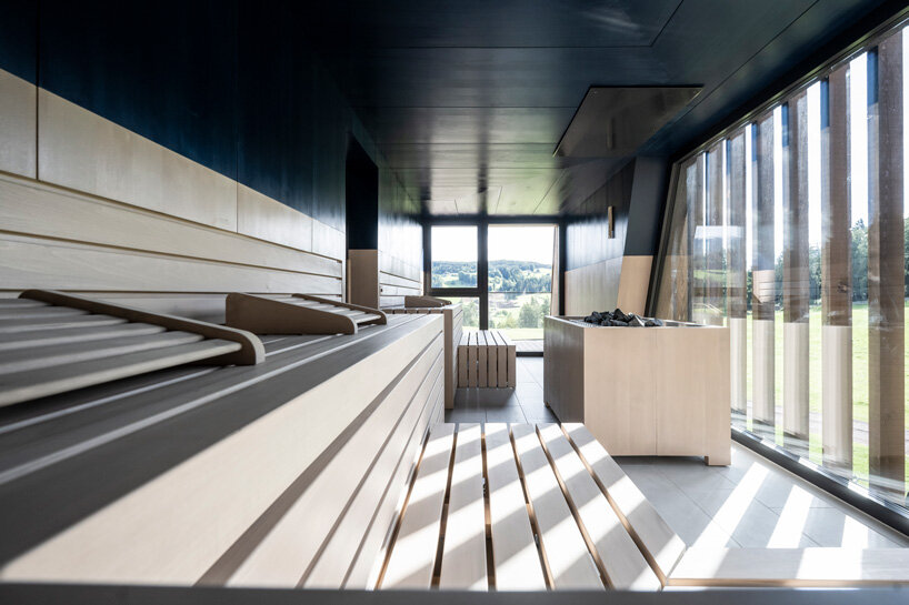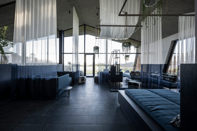 the project sits like a ring placed over the terrain, with its funnel-like roof forming a shaded perimeter walkway and an introverted core.