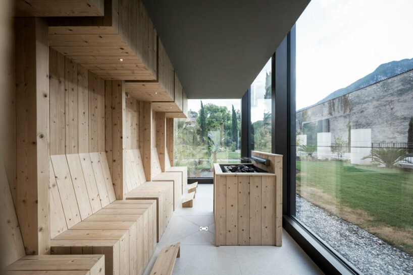 the project sits like a ring placed over the terrain, with its funnel-like roof forming a shaded perimeter walkway and an introverted core.