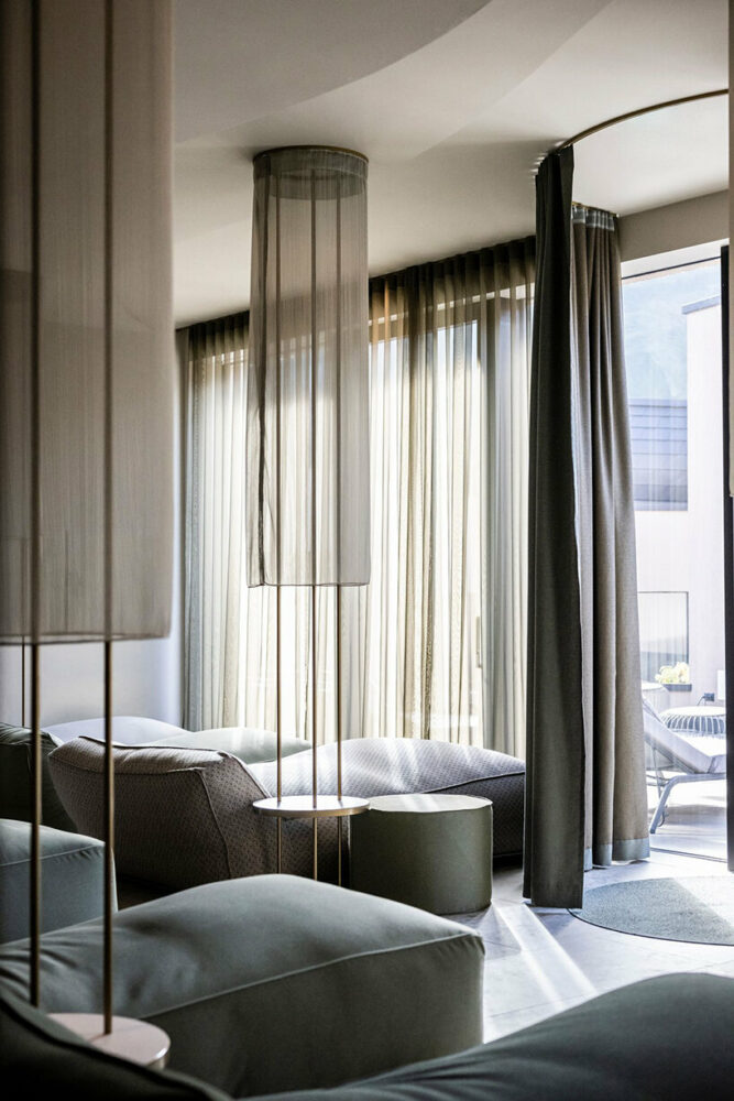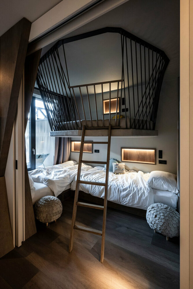 ‘In the children’s area, there are always three beds available, one of which, suspended from the ceiling, is a kind of nest-bed inspired by falcon, which is the symbol of the hotel. Even when it is not occupied, it is always an opportunity for the little ones to play and have fun,’ concludes interior designer Caterina Betti.