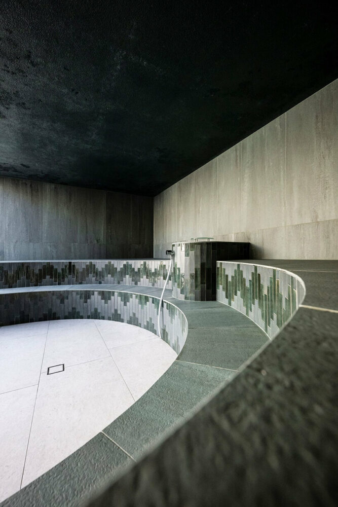The relationship between the resort and the small lake it overlooks has also been ‘redesigned’, creating an artificial hill along one bank, under which the adults’ spa is located. In addition, a large new terrace opens onto the lakefront and the partially covered swimming pool, which overflows onto the water mirror, giving guests the sensation of being authentically immersed in nature.