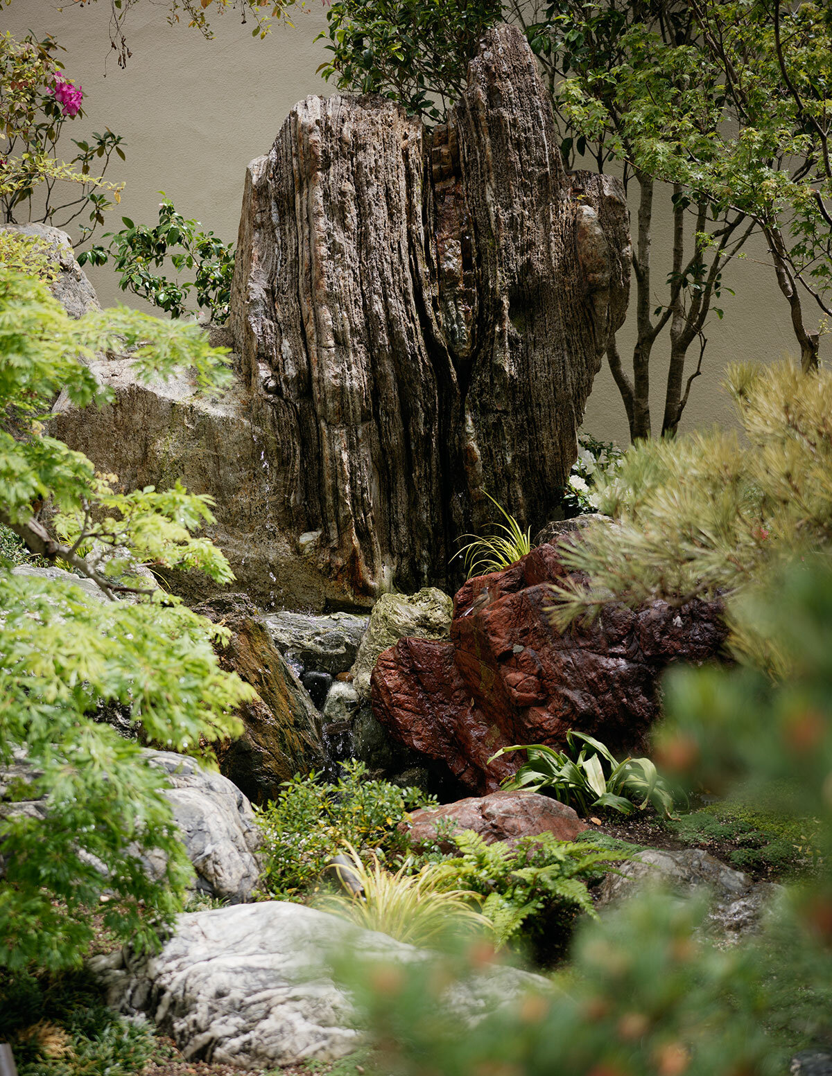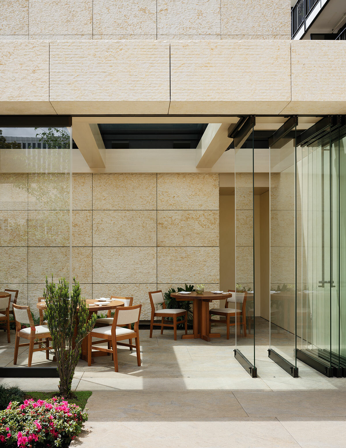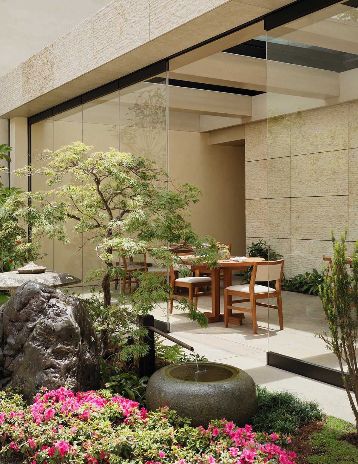 Japanese influences are evident in the restaurant’s design, including a bronze gate and stone tiles