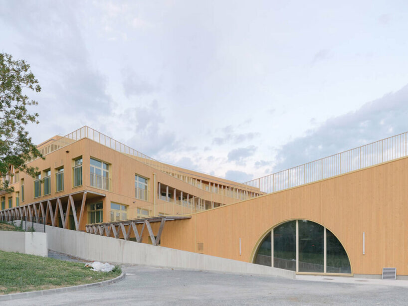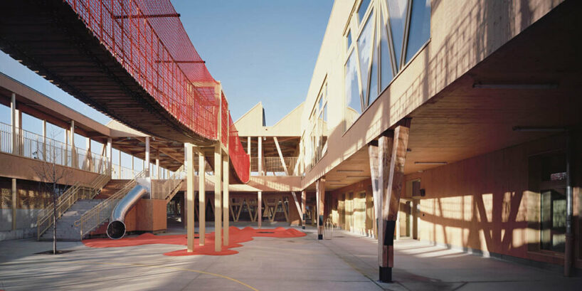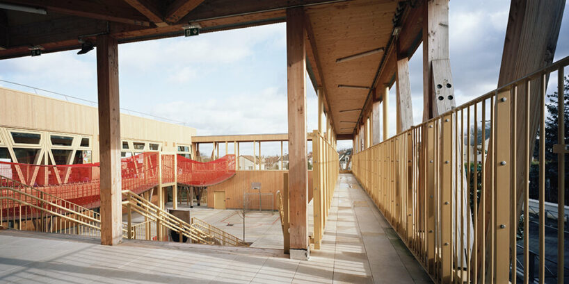 The program at Oiseau Lyre by r2k architecte (see more here) includes 24 classrooms for kindergarten and elementary students, as well as eight rooms intended as recreation spaces. Common spaces, including a multipurpose room with direct external access, a motor room, an art gallery, a library, a restaurant, and a sports hall are shared with civic associations when school is out. On a steep slope facing the Marne River, three levels of the four-level school are connected to the natural terrain, facilitating the safety of children. Located in the middle of a vernacular district, the project also respects the proportions of surrounding houses. On the playground, the design focuses on fun, proprioception, and participation of everyone in games of exploration, balance, running, and climbing. A walk-in cloister, enclosed by an ‘aerial suspension bridge’, continues its descent via a slide on the bumpy ground of the courtyard. In response to the City’s preference for a relatively dry area, the architects were able to locate the more natural part at the bottom of the plot, overlooking the Marne.