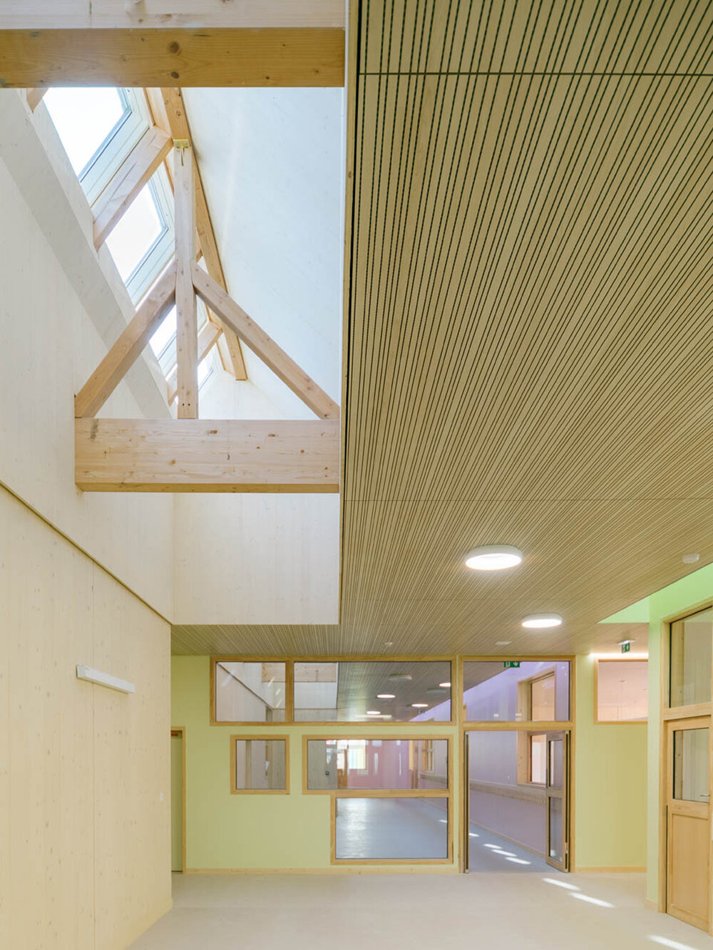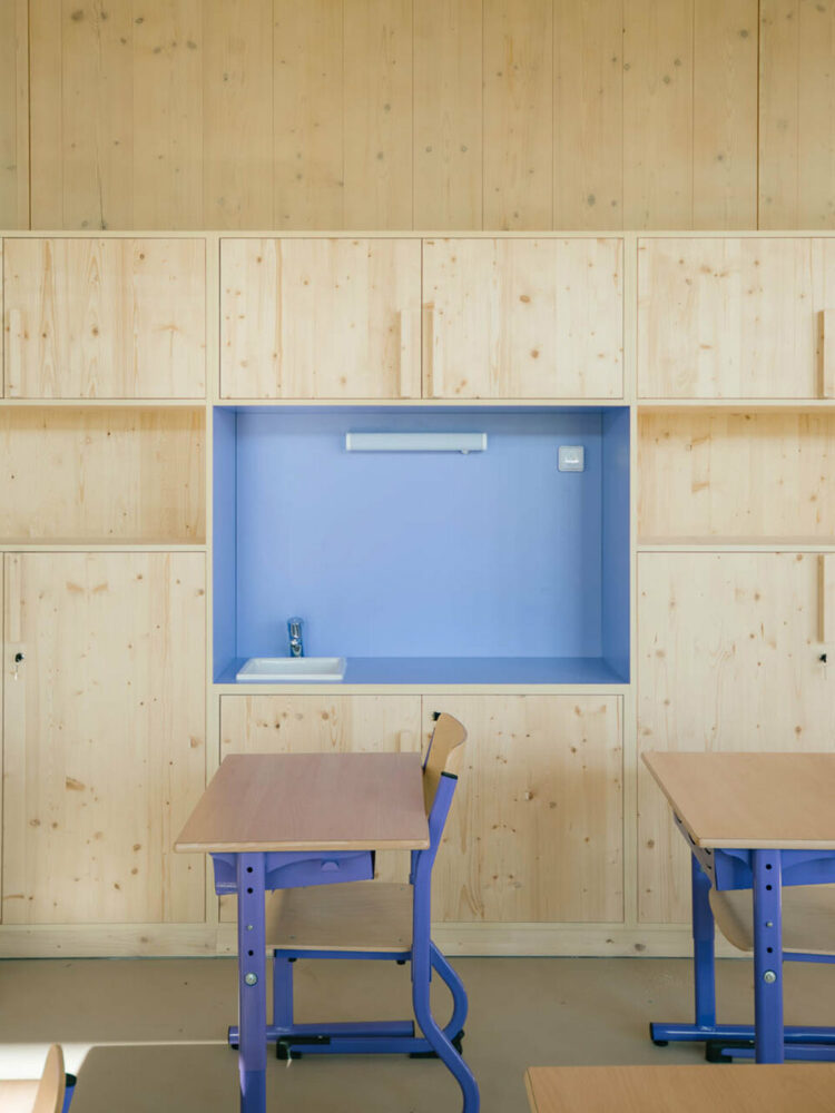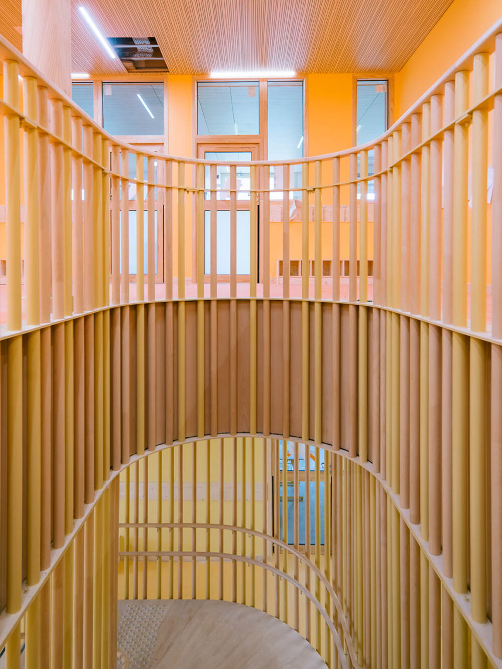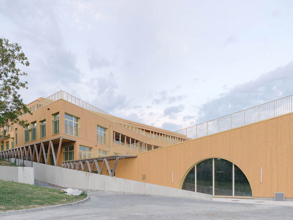 The project welcomes natural light into the heart of school spaces, despite its diminutive size of just 50mx100m. It is sculpted with light thanks to sheds, skylights, interior glazing, and more that highlight wood materials in the heart of the building through the atrium and the steps. Light and materiality are essential parts of well-being and, from the interior spaces, the view of the private gardens greatly contributes to a peaceful atmosphere. Acoustics defined by wooden ceilings, as well as indirect lighting, complete the soothing environment. The school’s ‘living wood’ consists of visible constructive elements and refined coatings, with pleated cladding cut to measure.