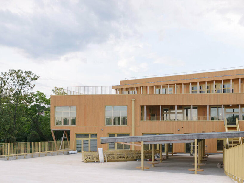 Grenoble-based firm r2k architecte presents Oiseau Lyre, a school with Nordic inspiration in Noisy-le-Grand, France. Anchored on a plot with eight meters of elevation, the school faces North toward the Marne and explores a new pedagogical model of Finnish design, offering a diversity of shared spaces. The compact building of 50mx100m is set on four levels, maintaining a low height profile about neighboring pavilions. Like a Palladian villa, functions are embedded in the core of the building, in an area filled with natural light and the social vibrancy of the school. With Oiseau Lyre, r2k architecte brings the city’s environmental and educational ambitions to realization by shaping a positive energy building made of wood. Based on recent cognitive research, it provides a framework for active pedagogies. In its spatial proposals, the school’s design incorporates the latest know-how of Nordic schools, and those of the Quebec Lab school, models which r2k architects Véronique Klimine (France) and Olavi Koponen (Finland) visited.
