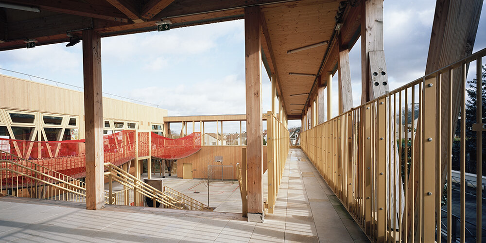 A renewable resource and carbon sink, wood provides both aesthetic and functional solutions while promoting the integration of a new urban element into the vernacular environment. Each zone in Oiseau Lyre has its structural typology, with truss lattices forming sheds, tree columns/ plank round wood, ribbed CLT floors, LVL accessible roof floor coffers, wood frame walls, CLT splits, and wooden beam posts as a primary skeleton. Crossing through the elementary courtyard to the gym, trusses of 22m are arranged in a shed to form a courtyard that introduces a soft light and supports the solar panels. A ribbed LVL floor supporting the courtyard crosses 22m on 4 supports above the gym, and are the largest caissons of this type ever made. The playgrounds’s rooftops were points of constructive innovation.