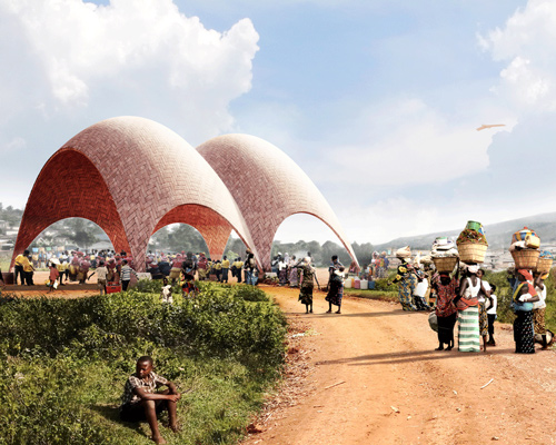 the droneport is imagined as a ‘kit-of-parts’ where only the basic formwork and brick-press machinery is delivered to site. the project’s raw materials, such as clay for bricks and boulders for the foundation, are locally sourced. the vaulted brick structure can be put together by members of the community, giving local workers important construction knowledge.