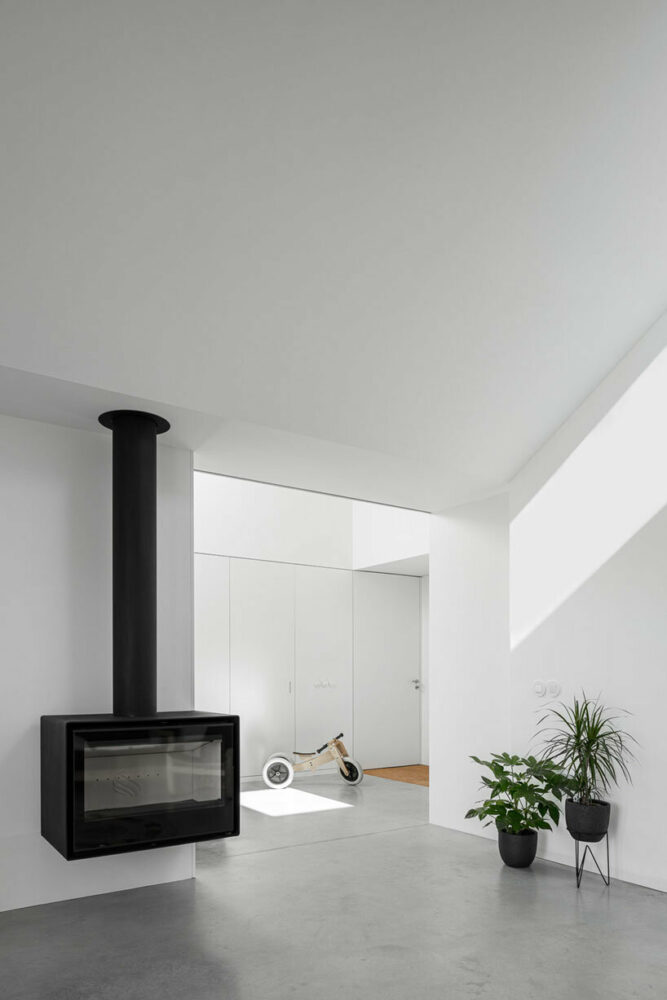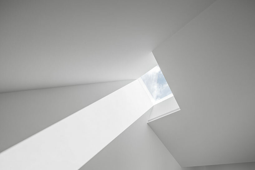 the design team continues: ‘concerning the shape of the building, the house was designed to create 3 main volumes that are oriented from north to south, each with a inclined roof system. the exception arises with the volume of the garage that closes the land to the north. these shapes are reflected on its interior, creating clarity and hierarchy of spaces.’