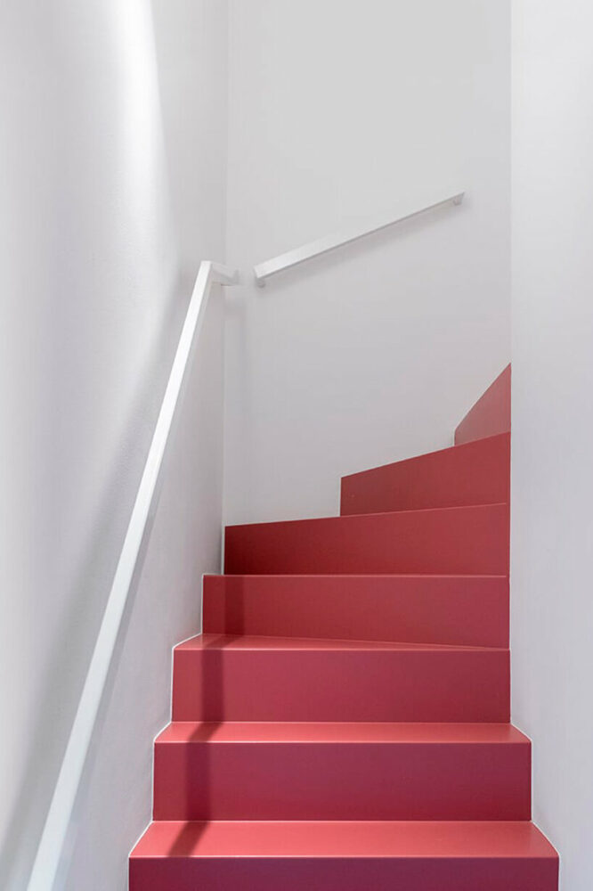 The newly added volume fulfills a hinge function between all spaces in the house. Visually, the new connecting tower is accentuated by the red brick contrasting the whitewashed facades of the existing buildings. The same stacked red bricks recur as interior finishes, highlighting the modifications that appear to cut through the existing structures. The design team deliberately exposes additions and corrections on the facades of the existing buildings in the style of the Japanese Kintsugi technique. This philosophy sees repairs as part of an object’s history, rather than hiding it. These ‘scars’ in the building are given the same red brick that covers the tower, forming a unique external appearance.