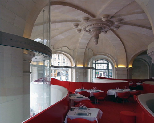 french architect odile decq has completed the ‘(phantom) l’opéra restaurant‘, which recently opened in the palais garnier located in paris, france. recessed within the historical building, visitors pass the facade’s original pillars to enter the undulating interior. the mezzanine space is carefully integrated to resist touching the existing structure’s walls, columns and roof. the contemporary addition compliments the classical details of the vaulted stone ceiling without altering history.